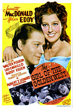 So while the team had not been absent from the screen very long, fans were clear in their demand for more of them together. Of course, this meant finding the right vehicles for them. Because the team’s initial films were all adaptations from stage operettas, many assume the same about The Girl of the Golden West, due to its score with music written by operetta king Sigmund Romberg, and lyrics by Gus Kahn. Actually the preceding iterations of this piece began with a dramatic play by David Belasco that first hit Broadway in 1905, and was later turned into an opera entitled La Fanciulla Del West by none other than Giacomo Puccini.