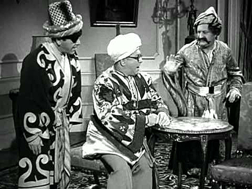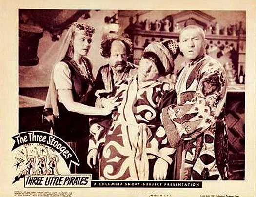 The story, in a nutshell; Moe, Larry and Curly are sailors whose New York City garbage scow runs aground and somehow strands them on Dead Man’s Island, home of pirates, buccaneers and freebooters, circa 1672. Condemned to death by the island’s governor (Vernon Dent) after whistling at his less-than-willing fiancée (Christine McIntyre)–“They’re sailors, all right!,” confirms Dent–the fellas hatch an escape plan with help from McIntyre. Disguised in ornate robes, turbans, and a pair of not-very-helpful eyeglasses for Curly, they’re presented to the governor as gift-bearing “wayfarers from strange lands.” Curly is introduced as “the Rajah of Canarsie” and Moe as his interpreter, “the Djinn of Rummy.” Larry never gets an alias because…you know, he’s Larry.