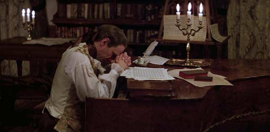 It’s in the worst ways, too. There are minor additions of “nothing” dialogue that have been plugged into what were previously well-cut scenes between the elder Salieri and the priest hearing his confession; the character of Mozart is diminished with the inclusion of scenes that show him begging for money. The film’s visual power is attacked in the scene where Mozart’s father surprises his son by awaiting him at the top of the stairway to his home; in the theatrical cut, after Mozart runs up the stairs and is enveloped in Leopold’s great black cloak, we properly cut away from this grimly strong image that closes out the moment to the empty space inside of Mozart’s home; we get a cleansing “rest,” however small, after this thunderously dark note. Once the cape is wrapped around Mozart, that scene is finished.