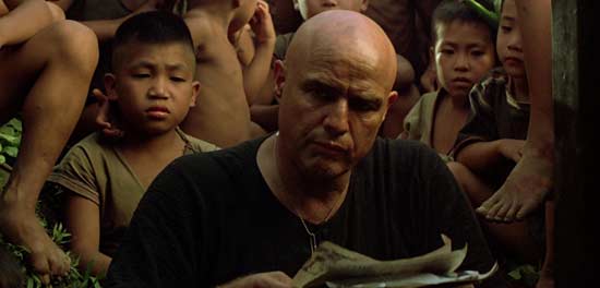 Now let’s get back to Brando, because it is footage that involves him that is the most problematic with the Redux version of this great film. If you’re not aware of exactly why Brando’s mad Colonel Kurtz character was filmed in shadow and kept mostly hidden from view, I again recommend a prompt viewing of Hearts of Darkness; once that decision was made to photograph Brando in that fashion, it became an integral part of the movie’s eerie power—a strength of the film that is utterly diminished by the inclusion of a scene where Kurtz, fully visible in the sunny daytime, reads to “errand boy sent by grocery clerks” Willard aloud from Time magazine while surrounded by children. This scene is absurdly pedantic and dull; as Brando drones on, the magic of his deranged ravings from earlier melts out of our minds (even Martin Sheen looks bored in the reaction shots) and the Kurtz character shrinks; he’s been built up in our minds as a titanic monster of mythic proportions…now, he’s just a pompous jerk.