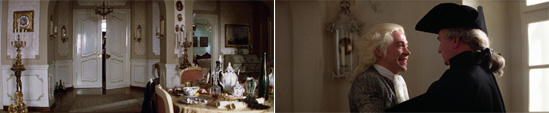 In the Director’s Cut, however, the powerful image of Mozart being enveloped in a death-like embrace is followed instead by the camera jumping on the action to the top of the stairway, diffusing the strength of that moment now with weak profiles of father and son as they exchange awkward verbal greetings, and then stumble their way inside the door. (The empty space inside the Mozart home, that moment we took to breathe while the previous image buried itself within us, is now of course eliminated as the men immediately enter the room on Mozart’s action of opening the door.) This added footage gives us nothing—in fact, it gives us worse than nothing because it propels the film forward not one useful bit while simultaneously deflating how strongly the visual of the previous shot had launched us into the next.