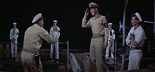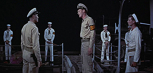 Not by me, though. The Martin Milner performance that played most prominently in my mind when I heard of his passing was one that came early in his career and only lasted for a couple of minutes. It comes roughly midway into the beloved 1955 WWII seriocomedy Mister Roberts, as the crew of the Navy supply vessel USS Reluctant are enjoying–some a little too enthusiastically–a long-overdue shore leave on an Edenic South Seas island. Executive officer Lt. Doug Roberts (Henry Fonda) watches as a truck pulls up along the pier and Shore Patrolmen surround the gangplank. The SP officer (a wonderfully subdued Milner, doing a laconic Southern drawl that’s always reminded me of Daws Butler’s wolf in those ’50s Droopy cartoons) comes on board and explains to Roberts what’s happened and why the Reluctant has been placed under “dock arrest”: