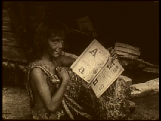 Tarzan stumbles on his parent’s old cabin and, in one of the more poignant scenes in the film, discovers their skeletons but fails to recognize their significance. He is far more interested in a knife and a picture book with which he begins to realize that B is for boy and M is for monkey.