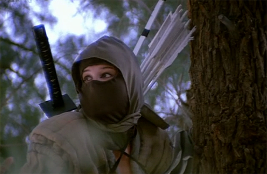 They shoot at the guy and he doesn’t even die. He even buries himself in the ground behind a smokescreen to escape the police. Somehow, riddled with bullets, he stumbles upon a telephone line worker named Christie (Lucinda Dickey). The ninja dies in front of her, but not before handing her his sword and chanting something.