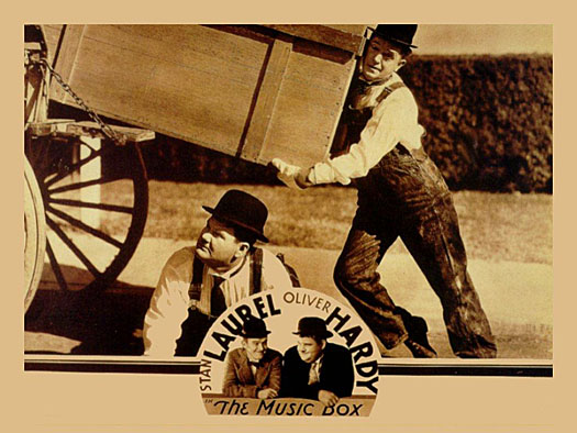 James Parrott‘s The Music Box (1932) stars Stan Laurel and Oliver Hardy as Stan and Ollie, two guys who pool their savings together (a total of $3.80) and start their own business, the Laurel & Hardy Transfer Co.