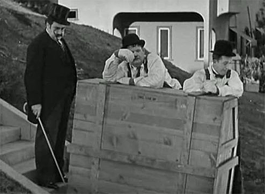 I would’ve quit right there, but Stan and Ollie are diligent and determined so upward they proceed to get the music box to its destination. Needless to say, the endeavor doesn’t go smoothly. The piano with Ollie in tow takes several tumbles down the long staircase. At one point the mishap occurs because a woman with a baby carriage wants to get by. Figuring out no way to allow the carriage the right of way the piano ends up back where it started. Making matters worse the stinker of a woman laughs, which results in her getting a deserved, swift kick…