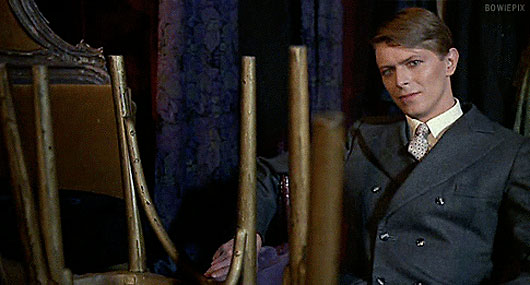 Playing the title extraterrestrial, Thomas Jerome Newton, in The Man Who Fell to Earth (1975).